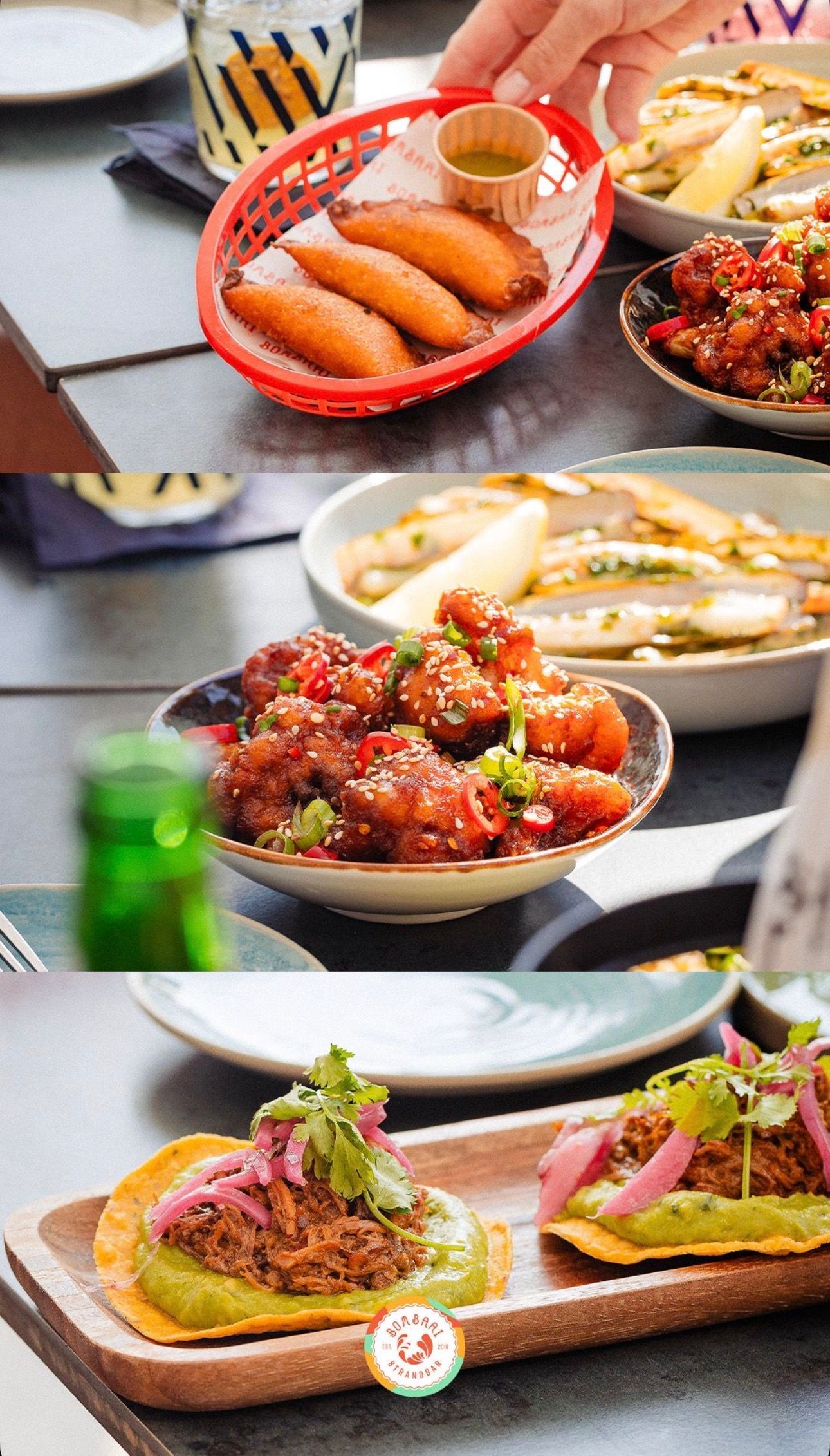 At Bombaai Strandbar, it's all about sun, flavor, and enjoying each other's company. Right on the coast, we've created a place where global cuisine, shared dining, and street food converge in a colorful and intimate setting. From tropical cocktails to boozy brunch on Saturdays and Sundays, every day at Bombaai feels like a vacation.